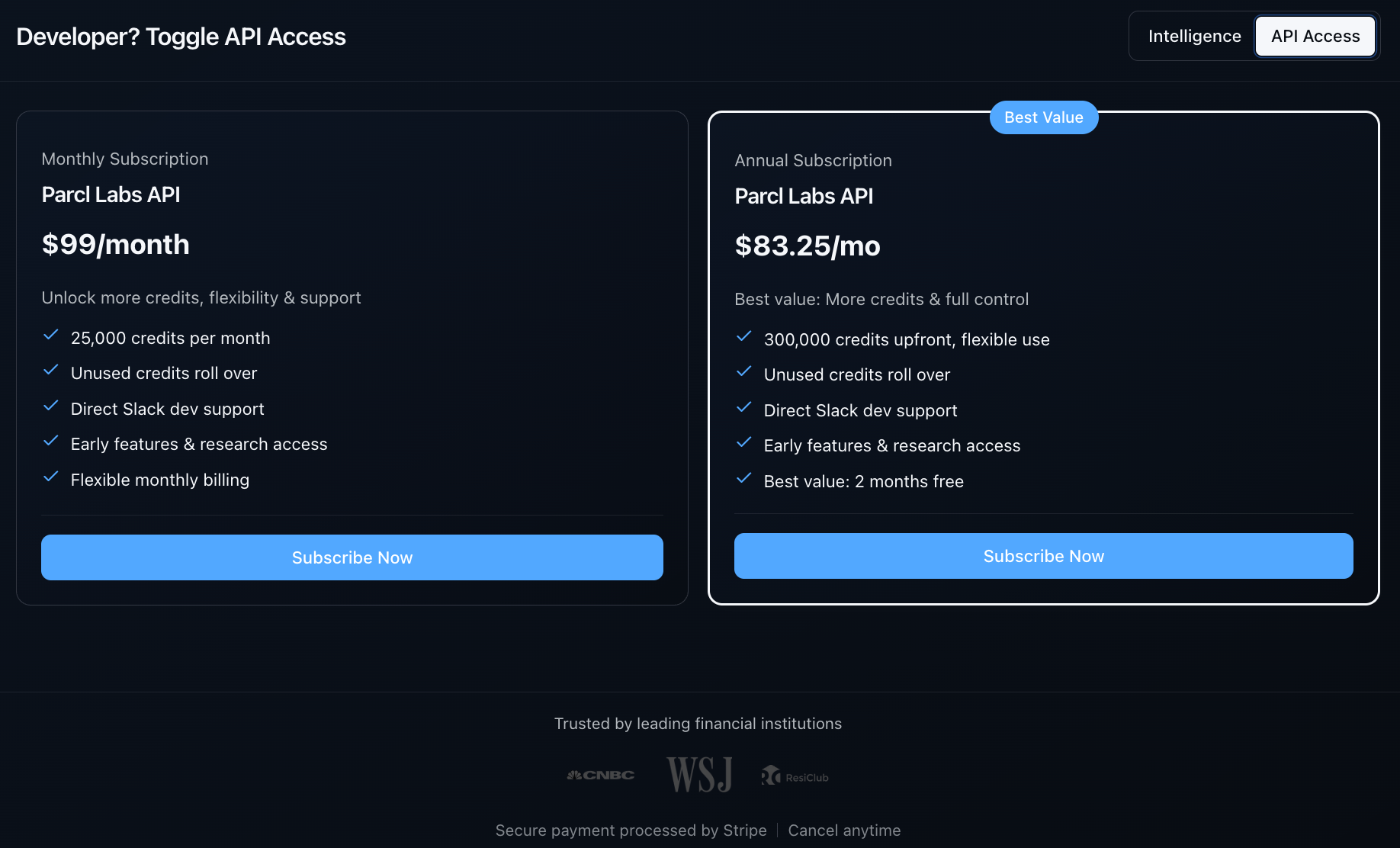- Direct support from Parcl Labs engineers and data scientists via our private developer Slack channel